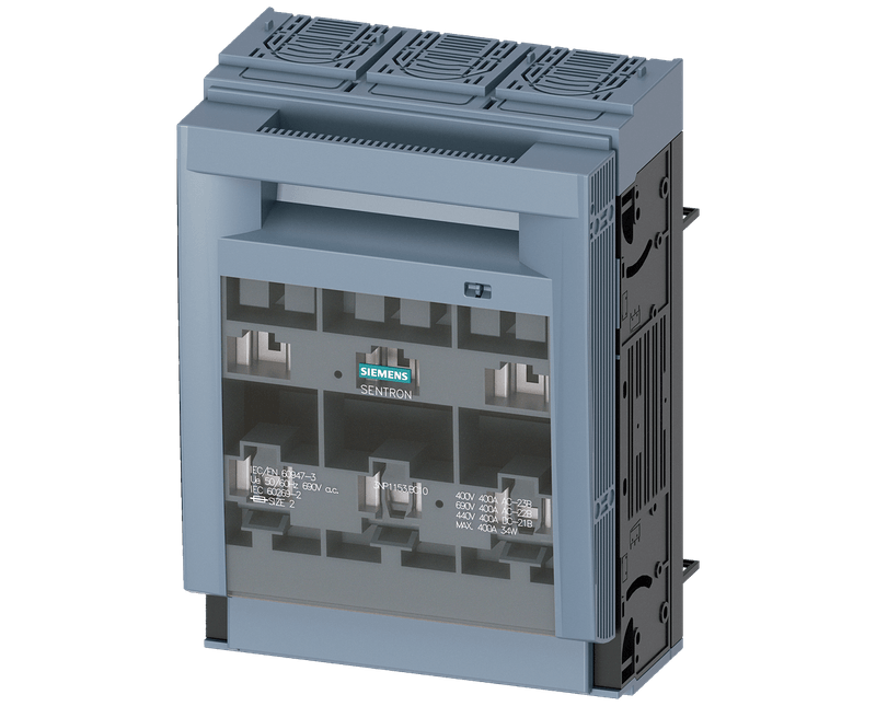 SENTRON, SECCIONADORA-FUSÍVEL SOB CARGA 3NP1, DE 3 POLOS, NH2, 400 A, PARA SISTEMA DE BARRAMENTOS COLETORES 8US 60MM, CONEXÃO PLANA, NÍVEL DA COBERTURA 32/70MM INTERRUPTOR SECCIONADOR DE FUSÍVEIS 3NP ATÉ 630 A COM PROTEÇÃO PARA PESSOAS E INSTALAÇÕES MELHORADA E TÉCNICA DE LIGAÇÃO PRÁTICA. OS INTERRUPTORES-SECCIONADORES DE FUSÍVEIS PROTEGEM INSTALAÇÕES NA ÁREA INDUSTRIAL OU DE INFRAESTRUTURAS DE SOBRECARGAS E CURTO-CIRCUITOS E SÃO INDICADOS PARA A APLICAÇÃO ABRANGENTE EM TERMOS DE SETORES. O ISOLAMENTO DE PROTEÇÃO E ANTICONTACTO, FORNECIDO DE PADRÃO COM A NOVA SÉRIE SENTRON 3NP1, PROTEGE O UTILIZADOR DO CONTACTO COM PEÇAS CONDUTORAS DE CORRENTE DURANTE A MONTAGEM DE SISTEMAS DE BARRAMENTO, MESMO EM CASO DE ACESSO PELA PARTE TRASEIRA. ADICIONALMENTE O UTILIZADOR CONSEGUE RECONHECER FACILMENTE OS FUSÍVEIS USADOS ATRAVÉS DA JANELA DE INSPEÇÃO. OS INTERRUPTORES-SECCIONADORES DE FUSÍVEIS 3NP SIEMENS DISTINGUEM-SE SOBRETUDO POR: 1. ALTAMENTE FLEXÍVEL DEVIDO A ESTRUTURA MODULAR E ACESSÓRIOS CORRENTES. 2. ADEQUADO PARA FIXAÇÃO PELA BASE, CALHA DIN E SISTEMA DE BARRAMENTO SIEMENS 8US 3. FUNÇÃO DE MONITORIZAÇÃO DE SEGURANÇA DE FUSÍVEIS ELETRÓNICA INCL. MONITORIZAÇÃO DA REDE. 4. CINCO TAMANHOS DE 100 A ATÉ 630 A ATÉ AO TIPO DE PROTEÇÃO IP40. 5. CONVERSÃO RÁPIDA E SEGURA PARA DERIVAÇÃO DE CABO EM CIMA / EM BAIXO. 6. POSSIBILIDADE DE TEMPO DER RESPOSTA FLEXÍVEL DO INTERRUPTOR AUXILIAR (SIMULTÂNEO OU COM AVANÇO). 7. POSSIBILIDADE DE VEDAR E SELAR.