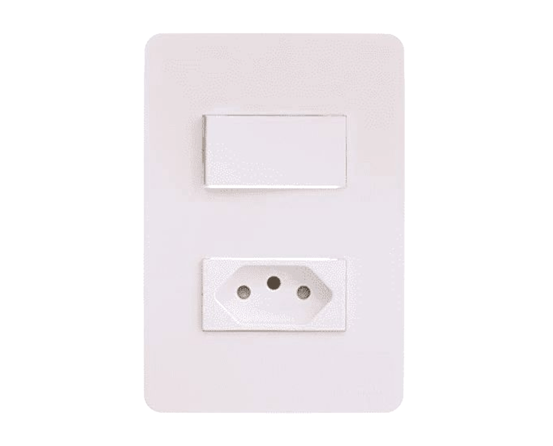 O Conjunto Interruptor Simples 10A + Tomada Branco Bipolar + Terra 10A S71323104 da Schneider é um conjunto elétrico composto por um interruptor simples de 10 amperes e uma tomada bipolar com aterramento, ambos na cor branca.