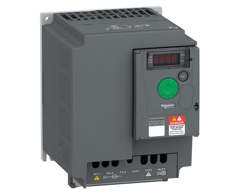 INVERSOR FREQUENCIA | NUMERO FASES: TRIFASICO | TENSAO ALIMENTACAO: 380 - 460 V | CORRENTE: 14,3 A | POTENCIA: 7,5 CV | MODELO: ALTIVAR EASY 310 | MARCA: SCHNEIDER| REF: ATV310HU55N4E|Inversor frequência Altivar 310 (VSD), Trifásico, 380-460 V AC, 5.5 kW, 7.5 hp, 12.6 A|Esta variador de velocidade / Inversor frequência (VSD / VFD) é ideal para controlar a velocidade do motor trifásico em aplicações de torque constante. É adequado para as aplicações mais comuns, tais como máquinas têxteis, máquinas-ferramentas, máquinas de trabalho em madeira, manuseio de materiais, máquinas de embalagem e impressão, máquinas de cerâmica. Possui um formato compacto, permitindo uma instalação flexível e fácil em uma placa de montagem. Ele também oferece uma tampa frontal, exibição de status e falhas e botão de navegação.