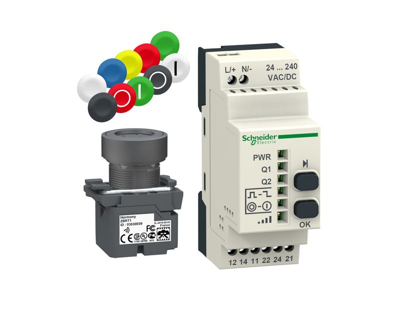 O kit do botão móvel sem fio é composto por uma base programável e um botão móvel (XB4R e XB5R) além de possuir diversos acabamentos (tampas) para sinalização no botão. É um transmissor e receptor de 2405 MHz, o receptor é programável e possui 2 relés, tem LEDs indicadores de status. possui protocolo de comunicação Zigbee, consumo de energia de 1 mW. é ideal para operações que requerem mobilidade do operador