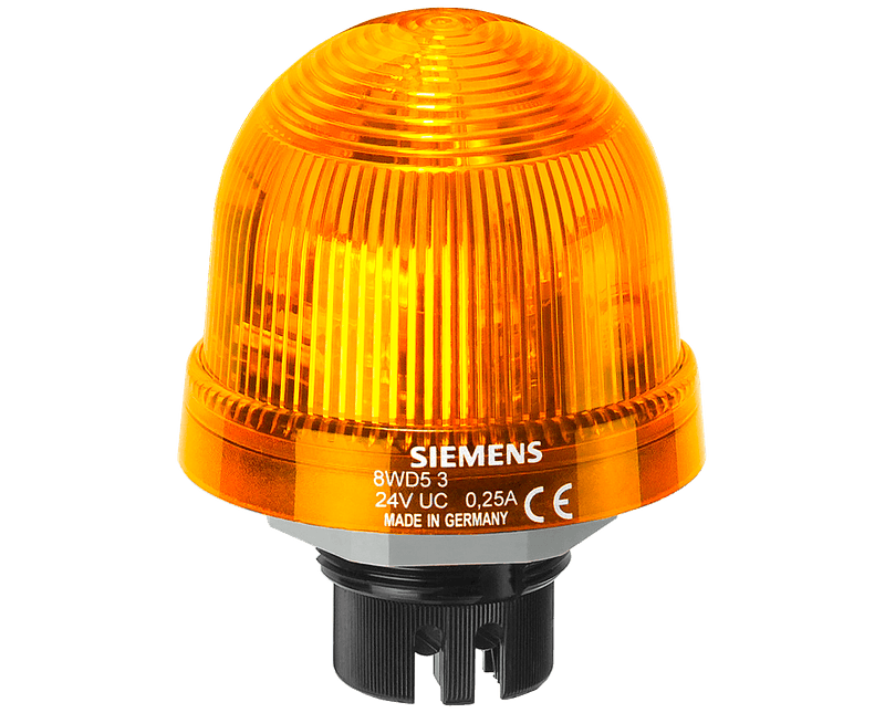 LÂMPADA DE MONTAGEM FLASH, COM ELETRÔNICA DE FLASH INCORPORADA, AMARELO, 230 V CA, DIÂMETRO 70 MM ELEMENTO DE FLASH SIRIUS 8WD5 INCLUI LÂMPADA PARA A SINALIZAÇÃO VISUAL EM CONDIÇÕES AMBIENTAIS ADVERSAS E PARA INSTALAÇÕES NO EXTERIOR, POR EXEMPLO, PARA ALERTA ÓTICO SOBRE O ESTADO OPERACIONAL EM INSTALAÇÕES DE PRODUÇÃO. AS LÂMPADAS ENCASTRÁVEIS E SÃO EXTREMAMENTE RESISTENTES A CHOQUES E VIBRAÇÕES. O SEU FORMATO ESPECIAL PERMITE UMA RADIAÇÃO IDEAL NO SENTIDO LATERAL OU PARA CIMA. PARA ALÉM DE UMA LUZ PERMANENTE, ESTÃO TAMBÉM DISPONÍVEIS LUZES INDICADORAS, LUZES ROTATIVAS E LUZES INTERMITENTES EM DIFERENTES CORES E TENSÕES. COMO ACESSÓRIOS, ESTÃO DISPONÍVEIS PÉS, TUBOS, ADAPTADORES, LÂMPADA DE INCANDESCÊNCIA, LEDS E ADAPTADORES PARA TUBOS. COLUNAS DE SINAL SIRIUS 8WD - MODULARES E APTAS PARA COMUNICAÇÃO.