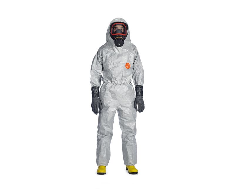 O macacão TF611TGY é fabricado com o material mais resistente da Linha Tychem, que fornece uma barreira contra ameaças químicas e biológicas. O modelo também é equipado com um capuz integrado para proteger a cabeça e as luvas para proteger as mãos. Além disso, o macacão conta com meias acopladas para evitar contato com o solo.