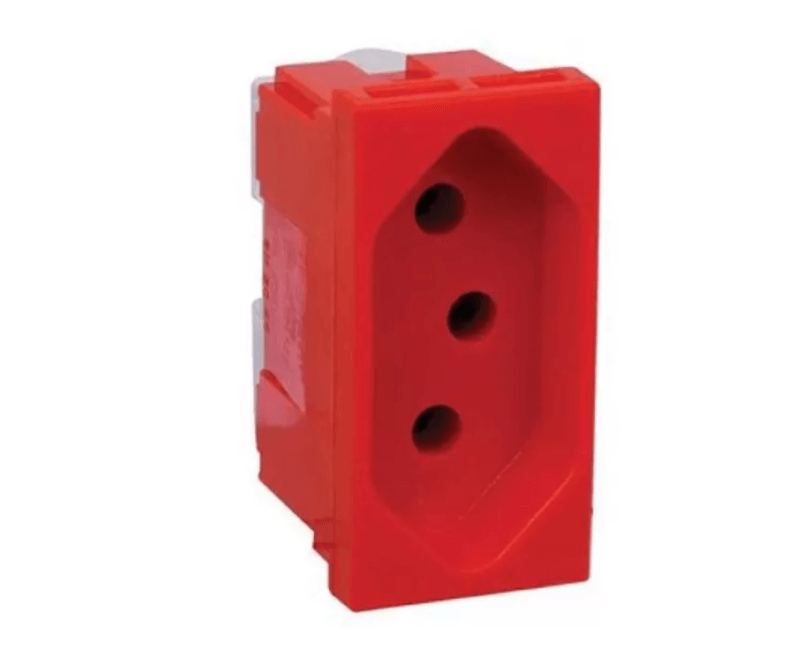 Disponível na cor vermelha, o módulo tomada possui encaixe para 2 polos mais o pino de terra, que é muito importante para garantir a proteção contra choques elétricos.