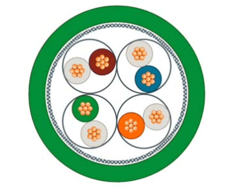 Filme laminado de alumínio sobreposto, envolto por um entrançamento blindado de fios de cobre estanhados