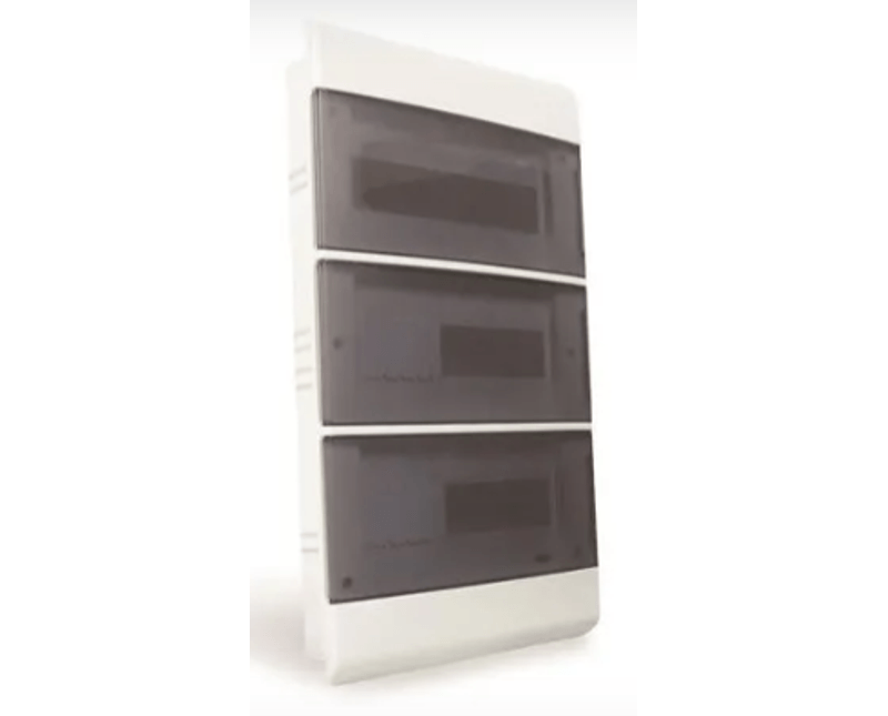 QUADRO DISTRIBUICAO DISJUNTOR | MATERIAL: POLICLORETO POLIVINILA (PVC) | COR: FUME | INSTALACAO: EMBUTIR | PADRAO: DIN | NUMERO DISJUNTORES: 8 | CLASSIFICACAO: IP-40 | DIMENSAO: 210X208X90MM | REQUISITOS ADICIONAIS: ABS C/BARRAT NEU/TERR | MARCA: STECK | REFERENCIA: SCM8TBRB