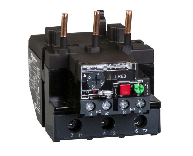 |Relé eletrônico de sobrecarga térmica 48A...65A - Schneider TeSys EasyPact TVS|O LRE359 é um relé de sobrecarga térmica EasyPact TVS da - Schneider para ser utilizado com contatores da linha E. Ele protege motores elétricos até 30kW@380V graças a uma faixa térmica 48A...65A, uma classe de disparo 10A e proteção contra desequilíbrio de fase. Ele fornece botões de teste e reset manual, reset automático e contato auxiliar de trip. Disponível em todo o mundo, é certificado para vários padrões (IEC 60947-4-1