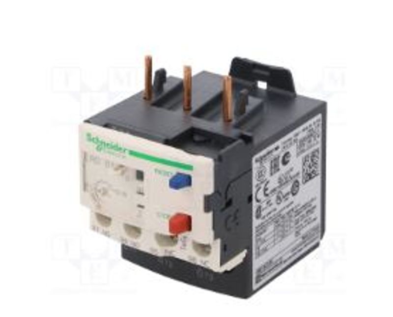 O LRD01, é um relé de sobrecarga térmica TeSys LRD da Schneider Electric para montagem direta em contatores TeSys D. Com uma faixa de ajuste térmico 0,10A...0,16A, uma classe de disparo de 10A e detecção de desequilíbrio de fase, ele protege os motores 0,06kW@380V. Ele fornece botões de teste & reset manual, reset automático, contato auxiliar de trip e sinalização de desligamento. Disponível em todo o mundo, é certificado para vários padrões (IEC, UL, CSA, CCC, EAC, Marinha) e compatível com Green Premium (RoHs / Reach).. Relé de proteção contra sobrecarga térmica, tipo bi metálico, com proteção contra desequilíbrio de fase (diferencial). . Montagem direta nos terminais inferiores de um contator Tesys LC1D09-D38 para formar uma partida compacta. . Leve e compacto, 45 mm de largura. . Temperatura compensada por uma boa precisão da proteção. . Controle manual com botões de teste e reset, seletor de reset manual / automático. . Sinalização de trip com contatos auxiliares 1NA + 1NF e indicador de desligamento. . Pode ser associado com blocos de terminais para montagem separada (LAD7B, LAD96) e dispositivos de controle remoto (LAD703, LA7D03)
