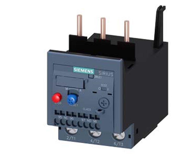 Relé de sobrecarga SIRIUS 3RU2 para proteção de cargas com partidas normais, contra aumentos excessivos de temperatura devido à sobrecarga ou falha de fase.