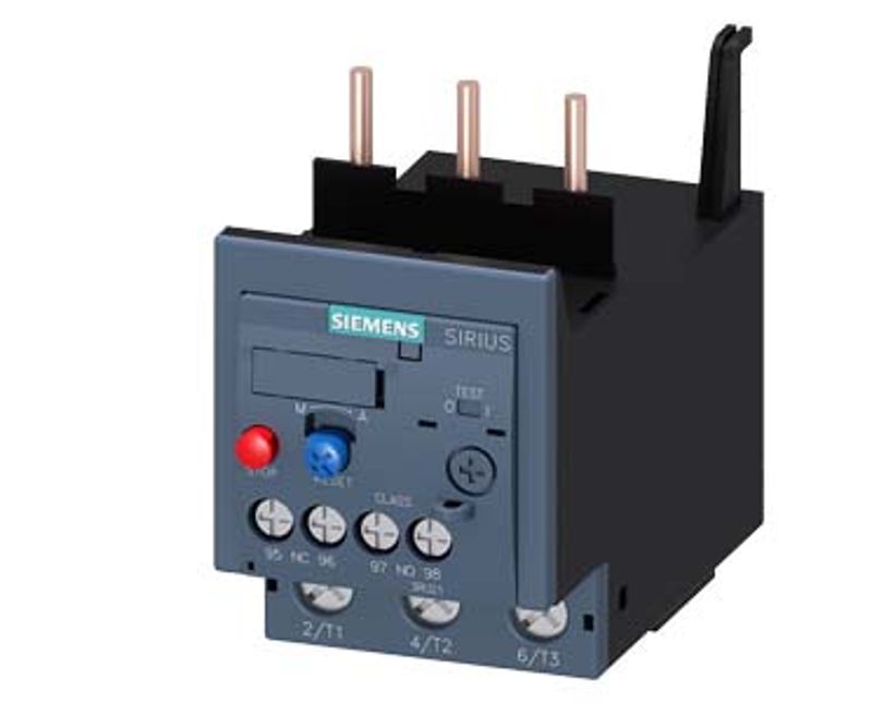 Relé de sobrecarga SIRIUS 3RU2 para proteção de cargas com partidas normais, contra aumentos excessivos de temperatura devido à sobrecarga ou falha de fase.