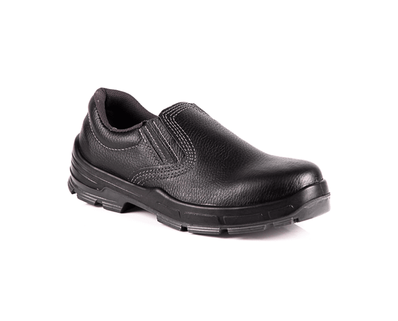 SAPATO DE PROTEÇÃO, COM ELÁSTICO FRONTAL RECOBERTO, COM COLARINHO ACOLCHOADO, CONFECCIONADO EM VAQUETARELAX PRETA, COM FORRAÇÃO INTERNA NA GÁSPEA EM NÃO-TECIDO E FORRO DO CANO EM NYLON DUBLADO COM MANTA DE NÃO-TECIDO COM TRATAMENTO ANTIMICROBIANO, SEM COMPONENTES METÁLICOS, PALMILHA DE NÃO-TECIDO, COM SOBRE-PALMILHA DE EVA ANTIMICROBIANA E SOLADO DE POLIURETANO INJEÇÃO DIRETA BIDENSIDADE BICOLOR