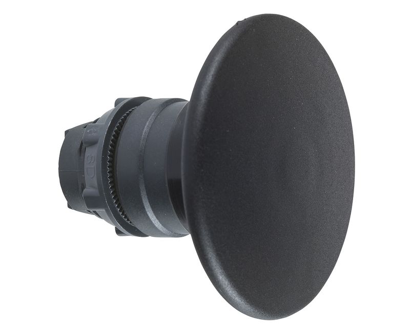 Este cabeçote do tipo cogumelo Harmony XB5 60mm é preto, opera com mola de retorno tem uma forma redonda e possui moldura de plástico.