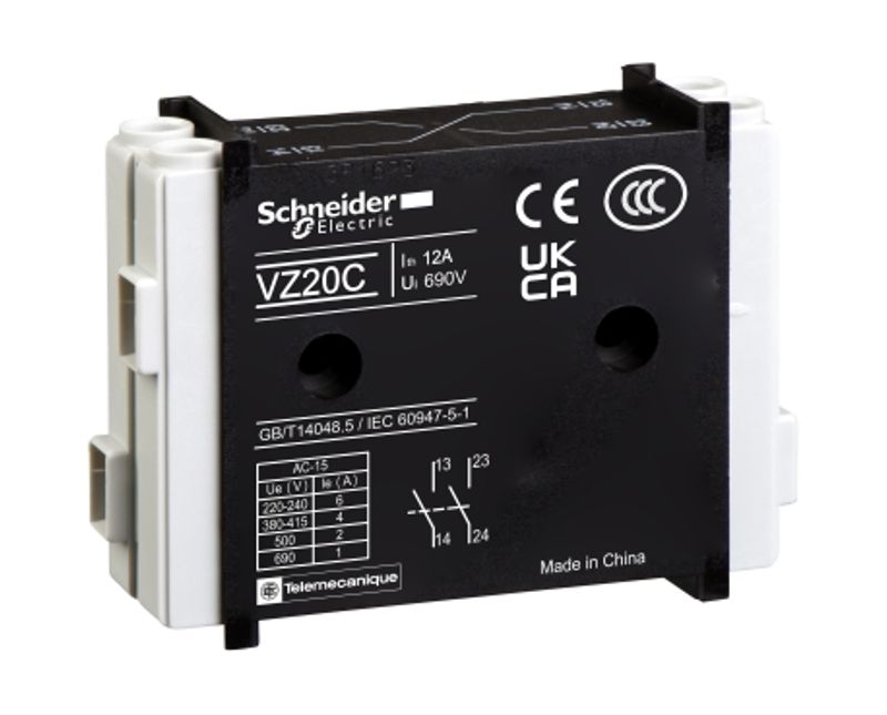 O VZ20 é um módulo de contato auxiliar adicional para as chaves seccionadoras TeSys Vario da - Schneider Para uso com os tipos de switch Vario V02 a V6, ele é montado em um lado do corpo do switch. Inclui contatos 2NO classificados para operação CA até 690V e operação DC até 250V. Disponível em todo o mundo, é certificada para vários padrões (IEC, UL, CSA, CCC, EAC) e compatível com Green Premium (RoHs / Reach).