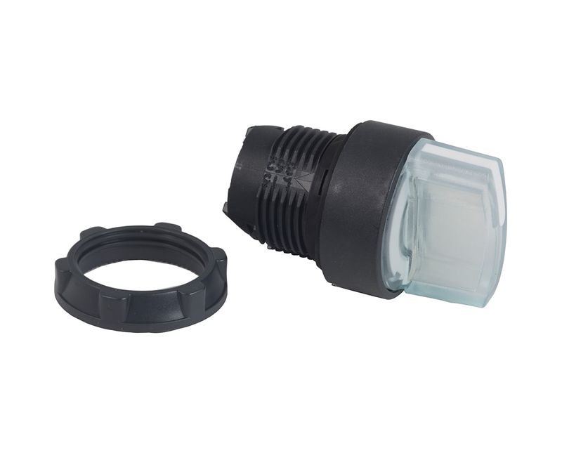 Este cabeçote de comutador iluminado Harmony XB5 Branco com LED integrante com manopla padrãotem 2 fixastem uma forma redonda e possui moldura de plástico.