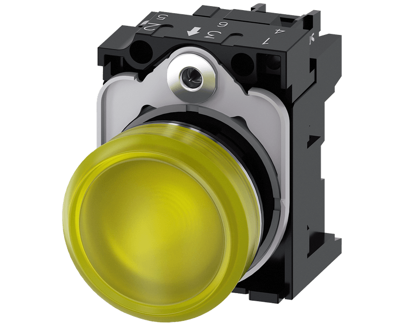 SINALEIRO COMANDO | FORMATO: REDONDO | FRONTAL: METALICO | LENTE: FACEADA | COR: AMARELA | FURACAO: 22MM | TENSAO ALIMENTACAO: 24V | ILUMINACAO: LED | REFERENCIA: 3SU11526AA301AA0
