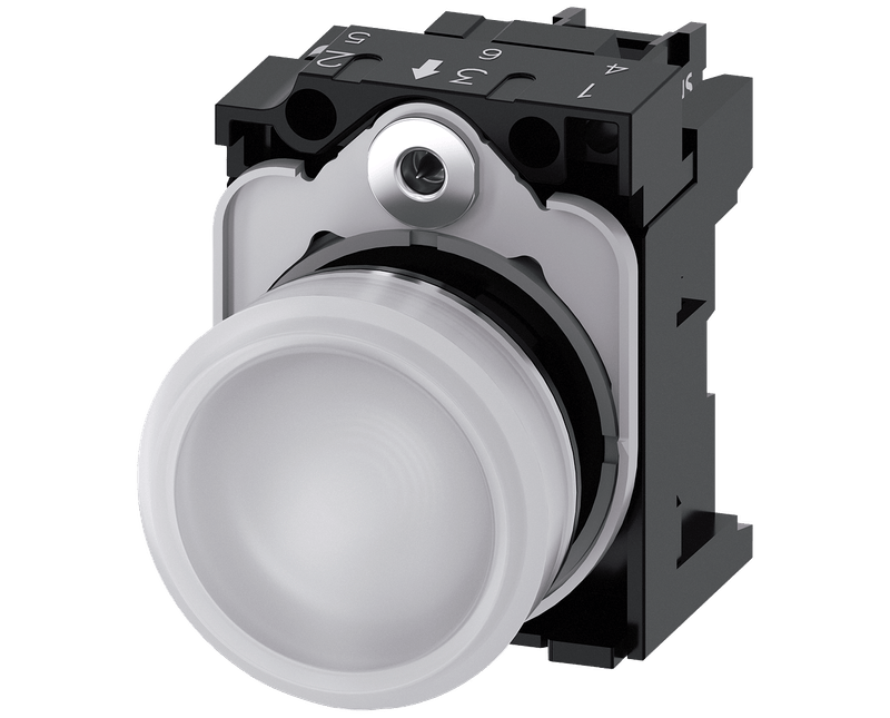 SINALEIRO COMANDO | FORMATO: REDONDO | FRONTAL: METALICO | LENTE: FACEADA | COR: BRANCA | FURACAO: 22MM | TENSAO ALIMENTACAO: 24V | ILUMINACAO: LED | REFERENCIA: 3SU11526AA601AA0