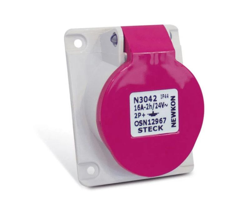 TOMADA INDUSTRIAL NAO METALICA | TIPO: EMBUTIR | MATERIAL: COMPOSTO TERMOPLASTICO | TIPO CONTATOS: FEMEA | NUMERO POLOS: 3 POLOS + TERRA | CORRENTE NOMINAL: 16A | TENSAO NOMINAL: 24V | FREQUENCIA: 50-60HZ | COR: LILAS | POSICAO PINO TERRA: 2H | BLOQUEIO MECANICO: S/BLOQUEIO | GRAU PROTECAO: IP-44 | PROTECAO: C/TAMPA | MODELO: NEWKON | MARCA: STECK | REFERENCIA: N4042