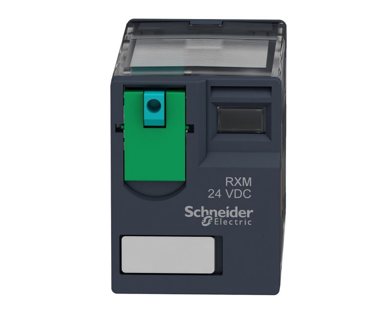 |- Schneider Zelio Relé RXM Plug-In6 A, de 24 V DC|Este - Schneider RXM plug-in tem uma tensão de 24 V CC controle da bobina e tem 4 contatos inversores , trabalha em 6A. Tem um indicador mecânico e um botão de teste bloqueável.
